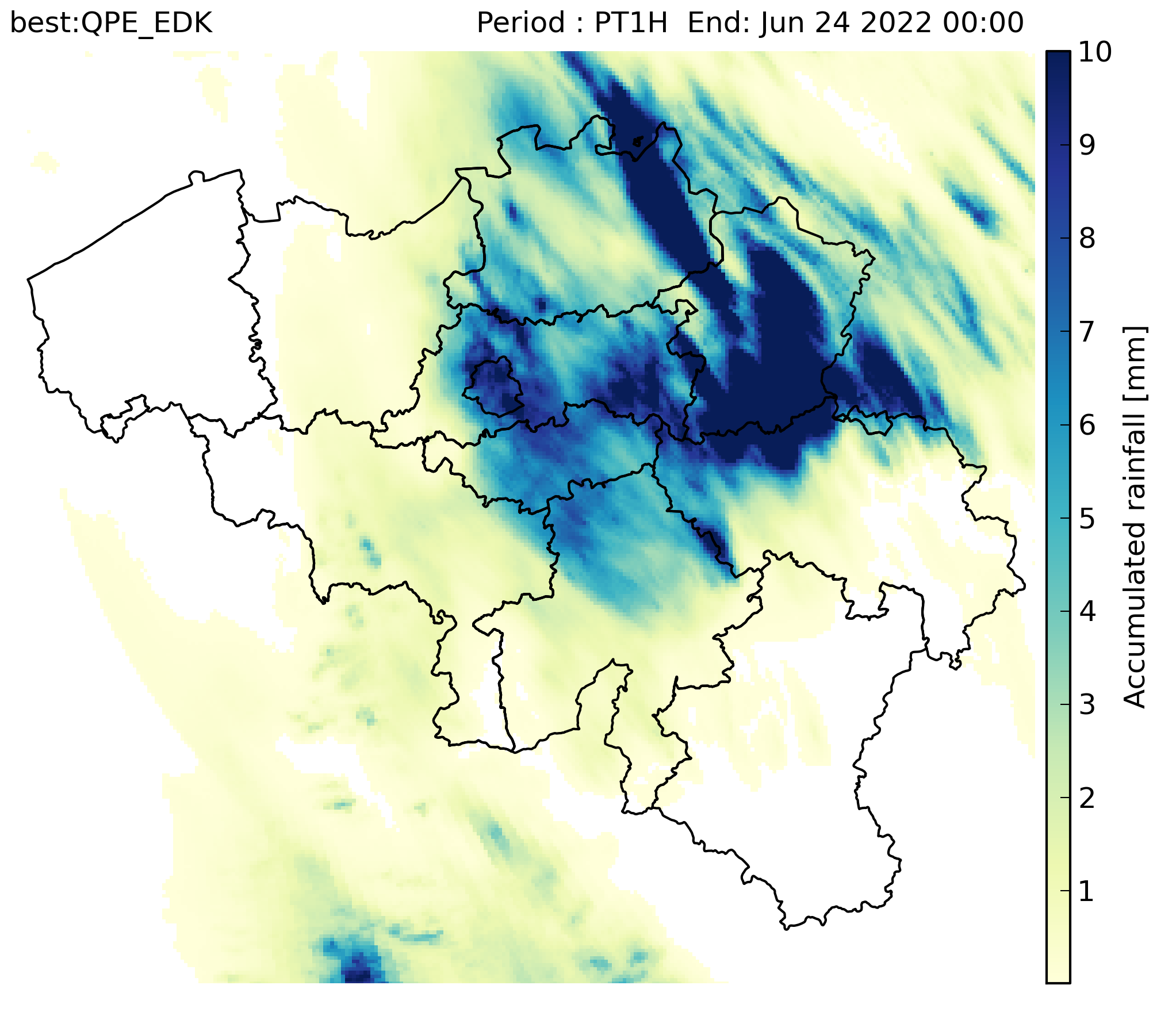 RADQPE provides high resolution radar-based quantitative precipitation estimation in realtime for Belgium and its surroundings. This product is not publically available yet.